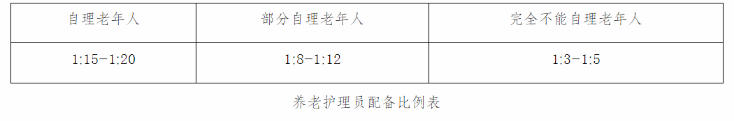 3.養(yǎng)老機構(gòu)工勤技能崗位人員的配備數(shù)量應(yīng)根據(jù)機構(gòu)規(guī)模、老年人能力狀況、入住老年人人數(shù)、服務(wù)需求、功能定位等進行合理配備,達到滿足技能操作和維護、后勤保障和服務(wù)工作開展的要求。其中,養(yǎng)老機構(gòu)應(yīng)按照實際入住老年人數(shù)量配備提供直接護理服務(wù)的專職養(yǎng)老護理員,配備比例應(yīng)不低于下表規(guī)定的下限值要求。養(yǎng)老護理員應(yīng)經(jīng)培訓合格后上崗。特種作業(yè)人員、消防設(shè)施操作人員和會計等應(yīng)具備相應(yīng)上崗資質(zhì)。