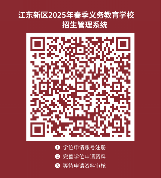 2月5日至8日,登錄“江東新區(qū)義務(wù)教育招生管理系統(tǒng)”(見附件,請(qǐng)掃描二維碼)平臺(tái),按要求上傳學(xué)位申請(qǐng)材料(資料不齊、信息有誤、未按時(shí)申請(qǐng)等情況,將不予安排學(xué)位)。